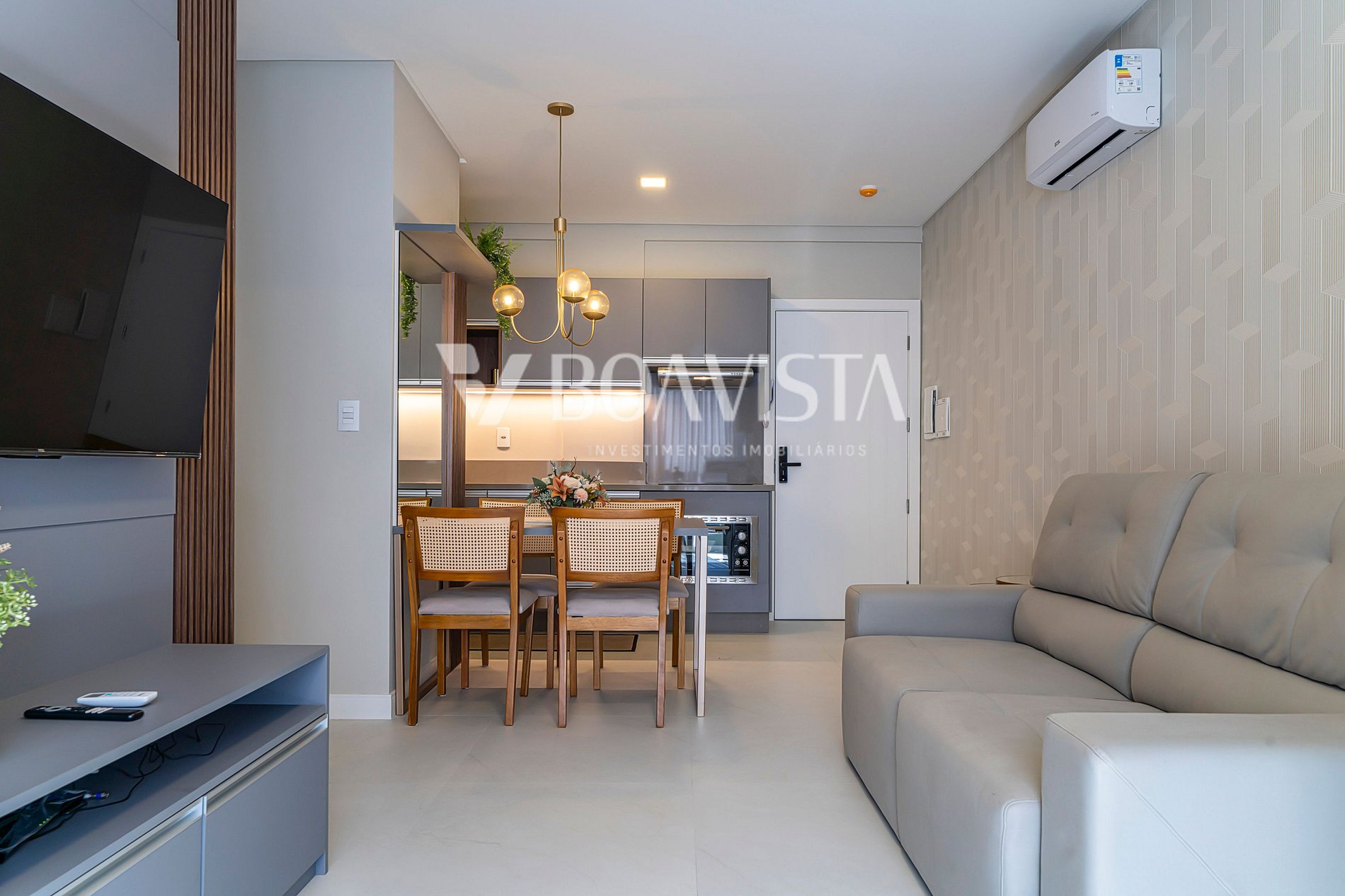 Modern and cozy apartment located in Residencial Sunny Flats, approximately 400 meters from Bombas beach in Bombinhas. It has a beautiful outdoor area with a swimming pool on the terrace, gourmet area, fire pit, games room, and kids' area.