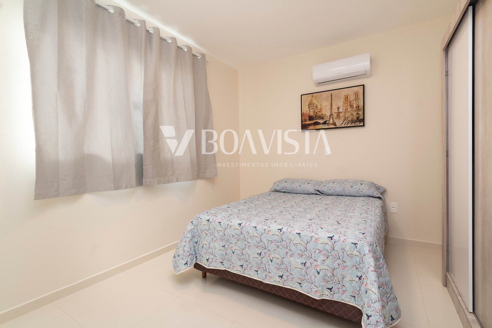 Quarto: uma cama box casal, um cama box solteiro, roupeiro e ar condicionado split