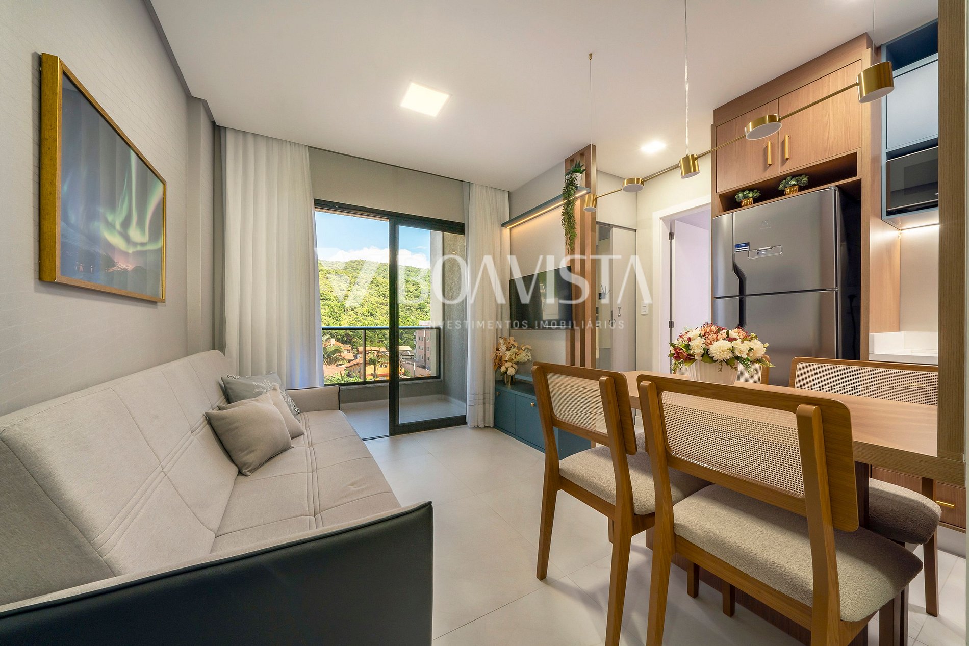 Dispõe de uma sala de estar e cozinha integrados com mesa de jantar, um banheiro social, com 1 dormitório climatizado, sofá cama na sala e oferece sacada com churrasqueira privativa.